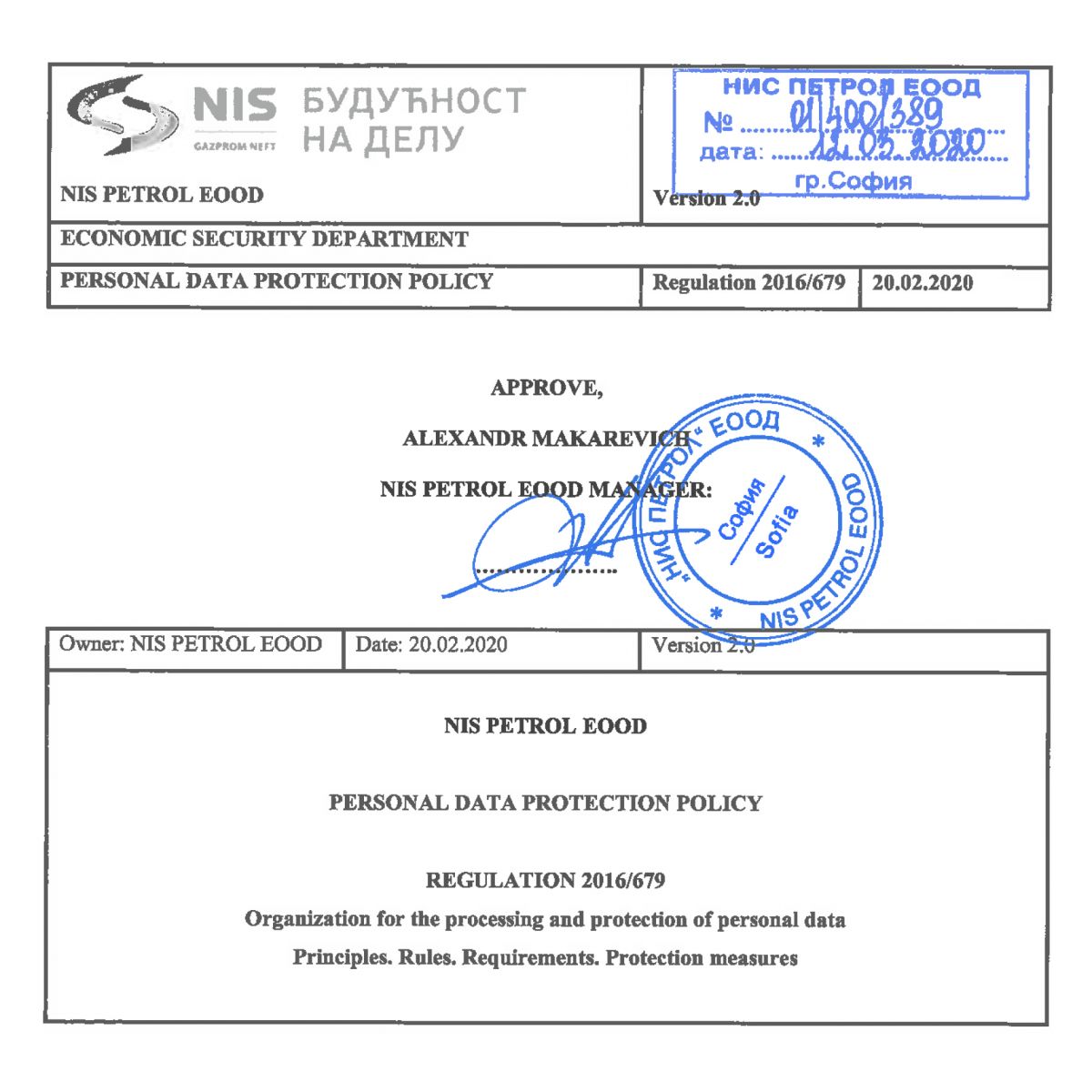 "NIS Petrol" EOOD maintains an appropriate system of technical and organizational measures to protect the data against unauthorized access and/or unlawful use of the data and/or against their loss, unauthorized alteration, disclosure, access, damaging and/or copying. The storage period of personal data is up to two months after the video surveillance has been carried out.